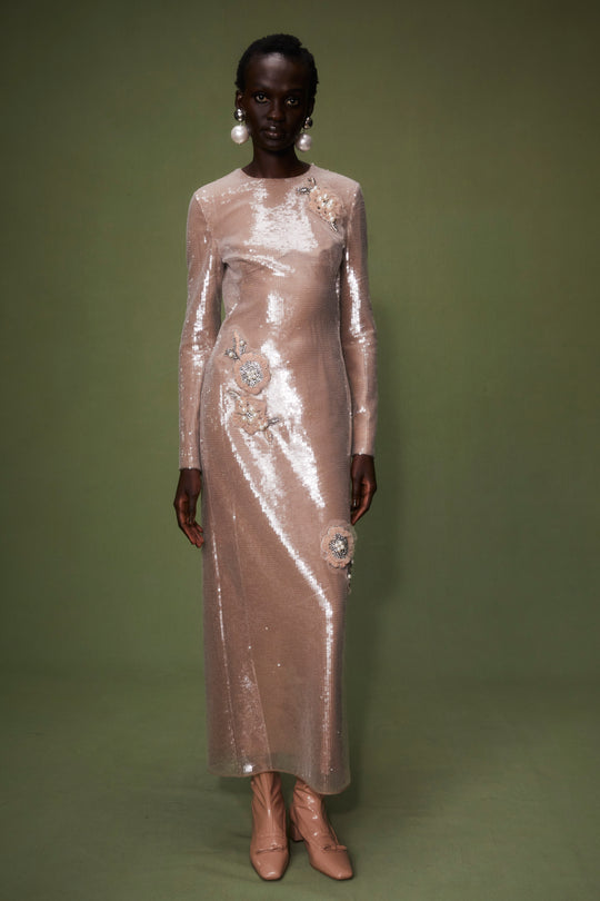 DAVIDA GOWN CAMEL EMBROIDERED SEQUINS