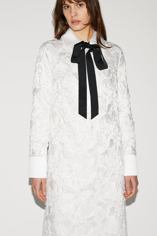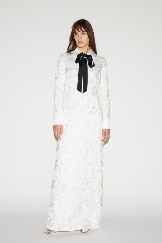 The Elena Gown is crafted from white duchesse satin with intricate floral cutwork. Featuring a crisp collar, contrast cuffs, and a removable black grosgrain necktie, it blends classic elegance with modern detailing. A refined choice for eveningwear or statement occasions.