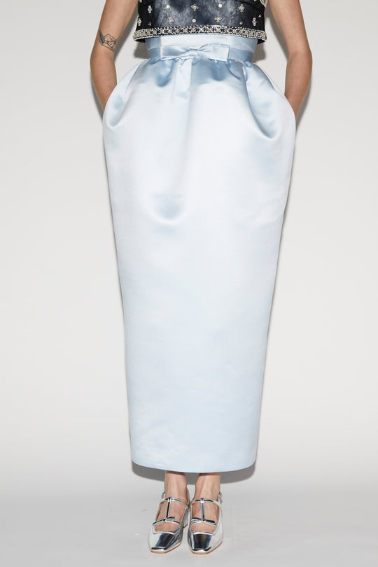 The Maris Dress is crafted from structured pale blue duchesse satin, featuring a sleek pencil silhouette with a softly gathered waist and bow detail. The bodice is overlaid with sheer black tulle, hand-embroidered with intricate crystal embellishments for a striking, jewel-like effect. A refined balance of classic elegance and modern glamour, perfect for evening occasions or formal events.