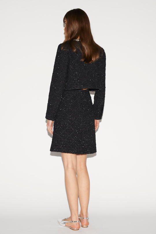 The Oriana Skirt offers classic sophistication with a modern, embellished twist. Cut from luxurious black tweed, it’s tailored to a flattering A-line silhouette and detailed with crystal-adorned pocket trims for subtle glamour. Designed to sit at the waist, it pairs effortlessly with the coordinating Milka Jacket or a simple blouse for versatile styling.
