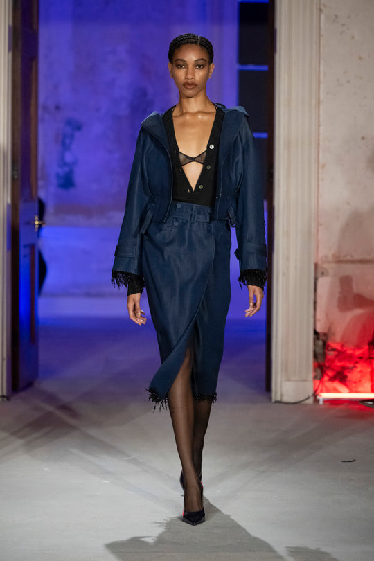 The Alvie Skirt is cut from rich indigo denim in a pencil skirt silhouette. The skirt features embroidered black bead fringe.