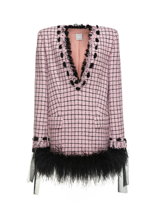 The Cyril is a structured, short shift dress made from this season's soft tweed. It has a V neckline, decorative pockets and a black feather trim. The Cyril features delicate black ribbon details and a back zip fastening.