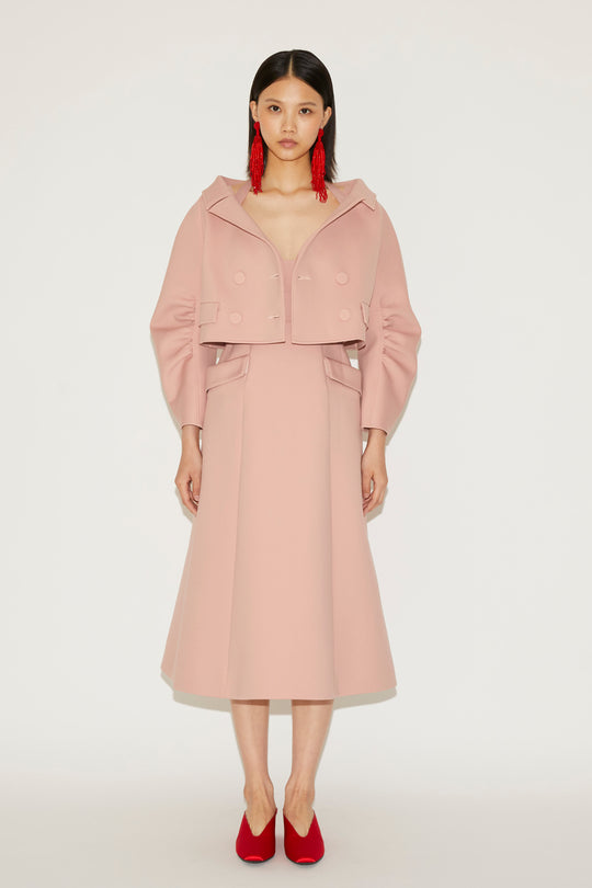The Darlene Jacket is a cropped jacket cut from pink neoprene scuba fabric. The jacket features a double breasted closure and can be worn open for a more relaxed look, and closed for a more polished look. The sleeves feature gathering for a structured volume.
