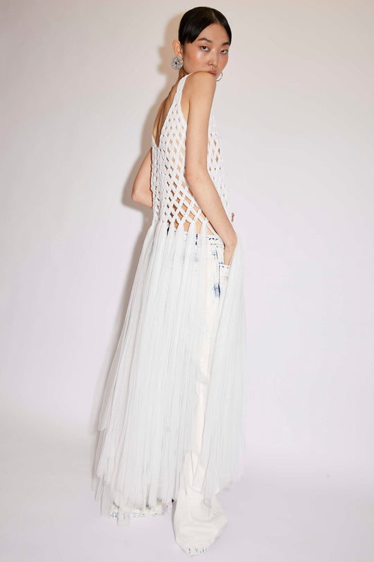 The Ethan is a macrame crocheted hand knotted tulle top with trailing fringe, ideal for layering due to its sheerness. Slips on.