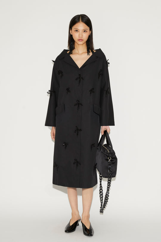 The Felix Coat in black cotton redefines classic outerwear with a playful yet refined touch. Designed in a relaxed, straight silhouette, it features hand-embroidered beaded bow embellishments scattered across the coat for an elevated, whimsical feel. The coat is detailed with a notched collar, subtle front-button closure, and oversized patch pockets for added functionality and charm. A versatile layering piece, the Felix Coat effortlessly blends practicality with statement-making design.