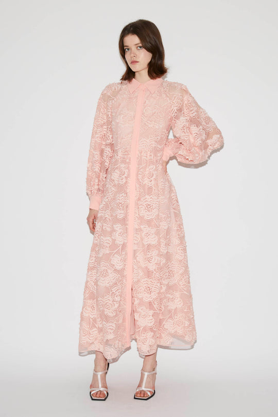 The Lilli is a waisted shirt dress made from embroidered organdie cotton with an all-over rose motif. The Lilli has voluminous long sleeves with buttoned cuffs, a concealed button placket and falls to ankle length. The body is lined with silk.