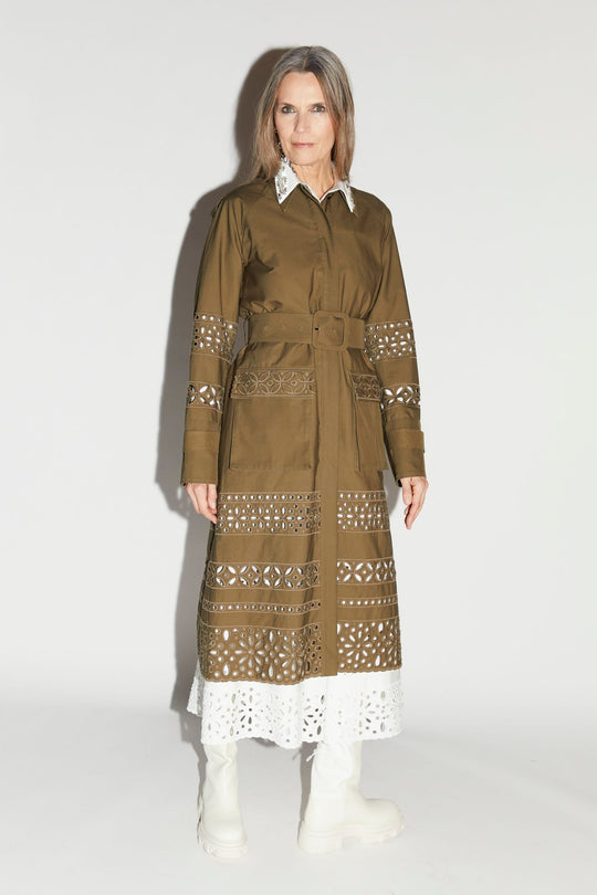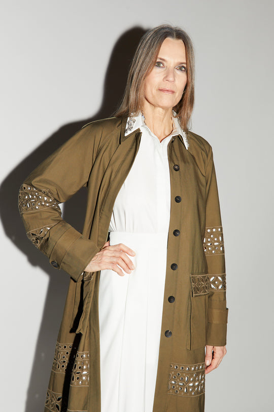 Mack trench coat olive green embroidered cotton gaberdine