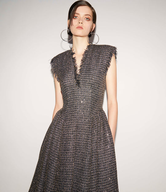 The Madame is a knee-length sleeveless dress, cut from a day-to-evening lurex, fringed tweed, in a fit-and-flare shape. The dress features a V-neck and a pleated skater skirt. Lined with silk.
