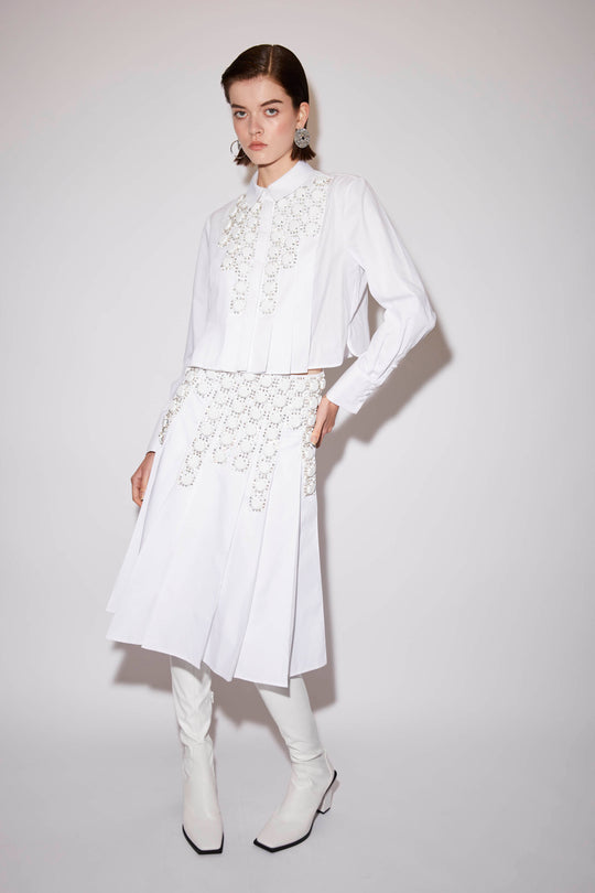 The Maniya is a waist-length structured cotton poplin shirt with a concealed button placket and box pleats throughout the front. The Maniya has a bib collar embellished with tonal circular stone studs and crystals.