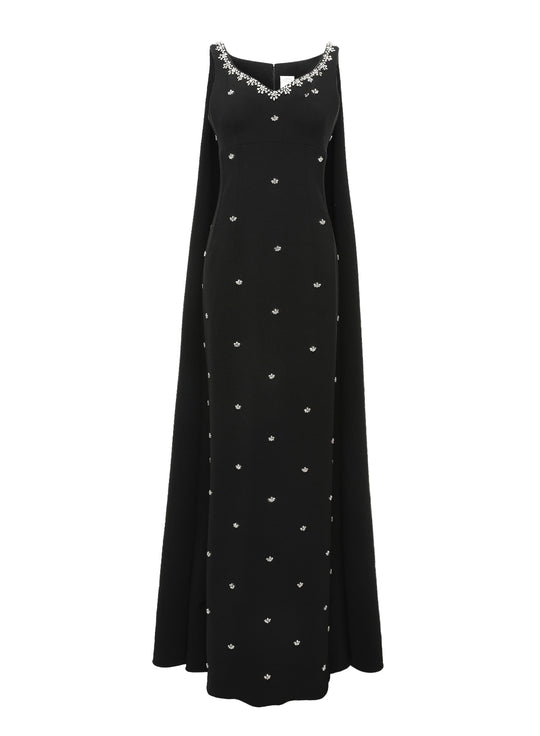 The Margherita Gown is a sleeveless gown tailored from black Italian Crepe Cady embellished with crystals. It has a heart-shaped neckline, full skirt and Watteau back.