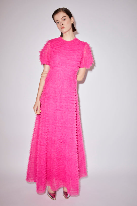 The Odette Gown is cut from embroidered tulle, with a textured pattern throughout. The Odette has short puffed sleeves, empire line design with a darted bodice, lightly padded shoulders and a tonal grosgrain belt. The soft A-line skirt falls to floor length.