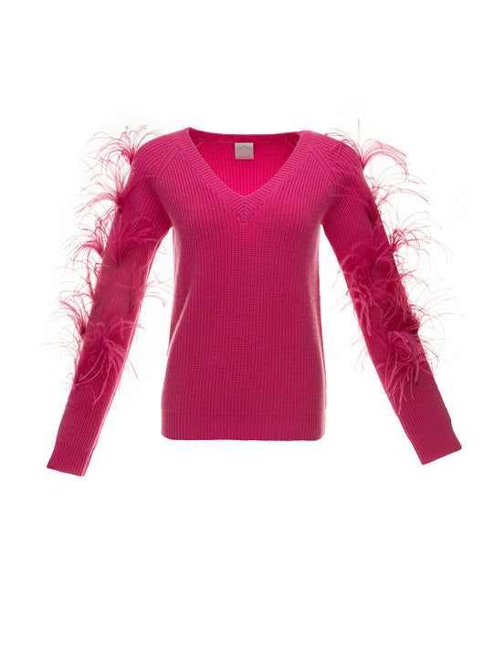 The Brenna is a pullover knitted from 100% cashmere. It features an elegant V-neck and sleeves dusted with ostrich feathers.