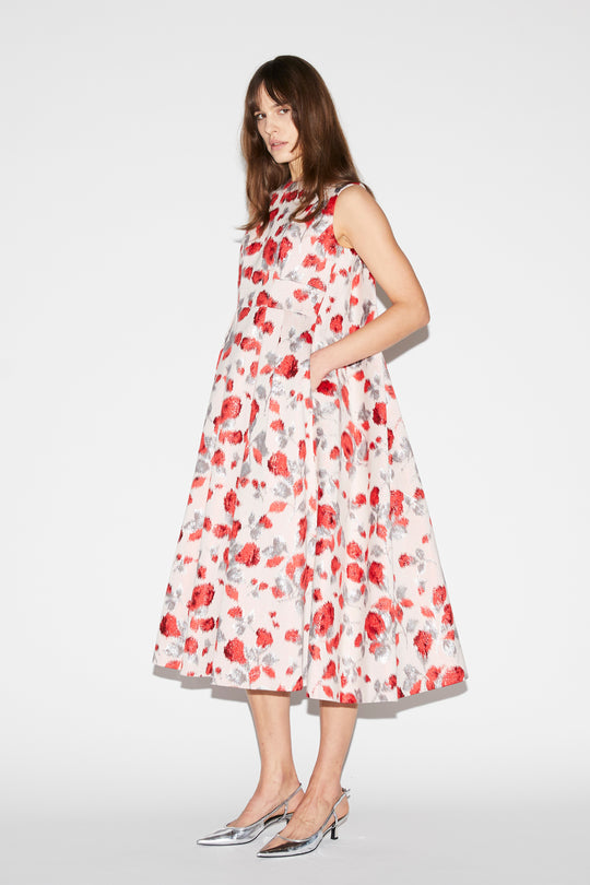 A statement of elegance and timeless charm, the Renee Dress is crafted from luxurious floral jacquard, featuring a stunning interplay of red and silver blooms on a soft ivory base. The sleeveless, A-line silhouette offers a graceful, voluminous drape, while the high neckline adds a refined touch. Thoughtful details include discreet side pockets for effortless functionality.
