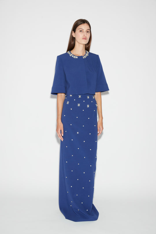 The River Jacket features a classic round neckline and can be worn open for a relaxed look or closed for a more polished appearance. Its scattered crystal embellishments add a touch of glamour. Wear back to our Devon Gown.
