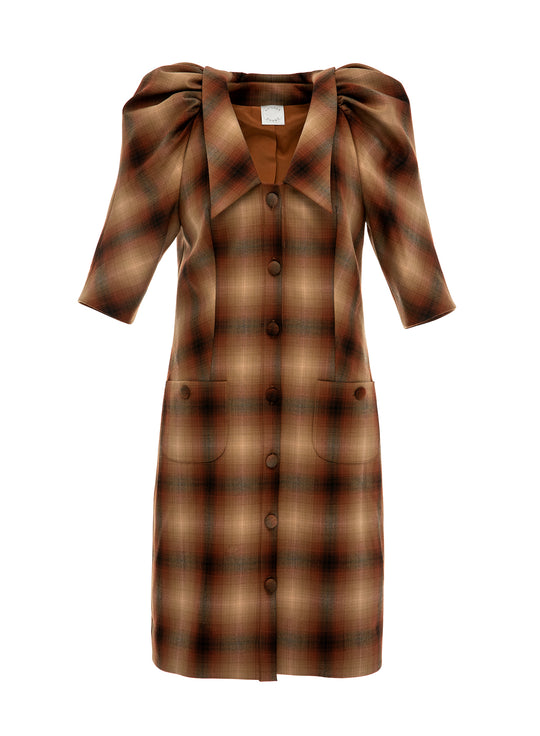 The Amanda is a short sleeve, button-down mini dress with an open neckline thanks to a flattering dropped collar. It has patch pockets and is made out of an Italian fabric that is a degrade wool check.