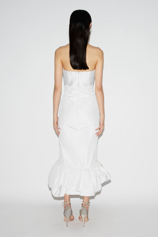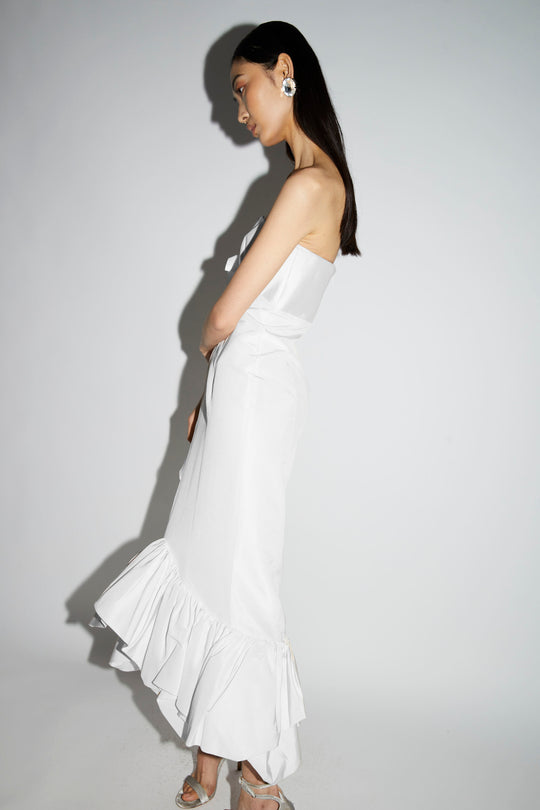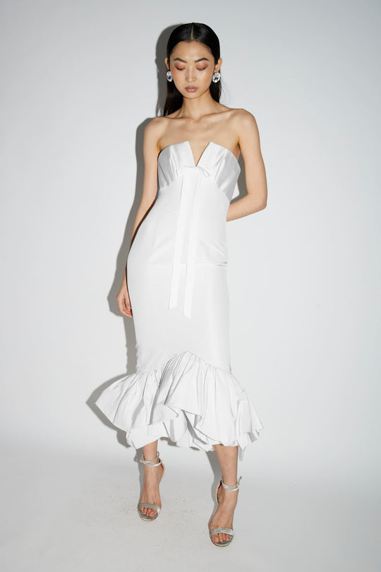 Exclusive to huishanzhang.com, the Candra dress has an ivory silk taffeta body with a sweetheart neckline in tonal duchess satin and a large ruffle peplum hem to offset the form-fitting silhouette. It zips at the back and features a white grosgrain ribbon detail that falls at centre front.