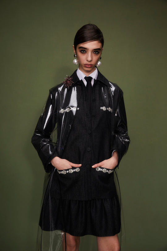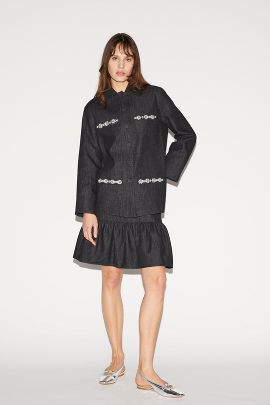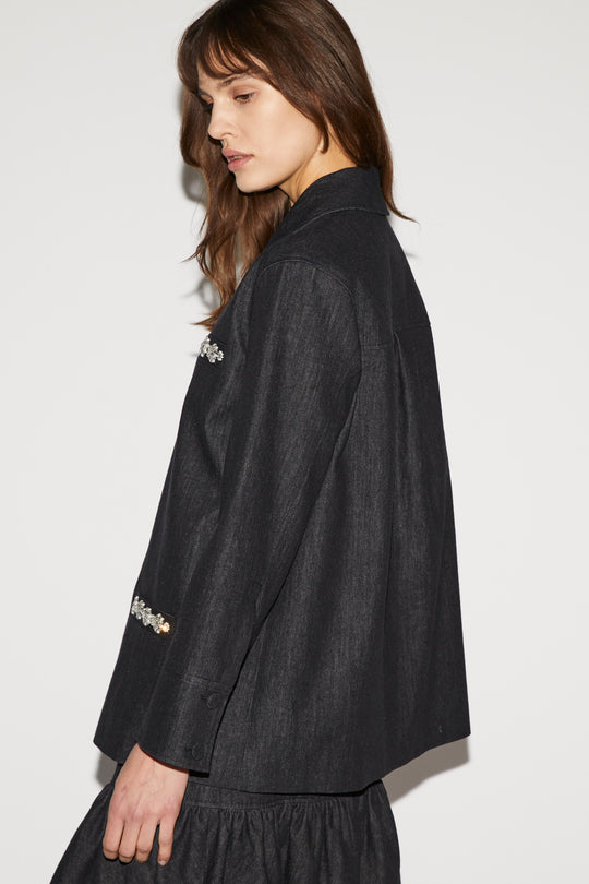 Elevate your outerwear with the Klaus Jacket in Denim, a contemporary staple. Crafted from rich, dark denim, this jacket is tailored in a boxy, clean silhouette with a minimalist mandarin collar and tonal button front. Its understated elegance is elevated by delicate crystal embellishments across the chest and hip areas—each motif arranged in intricate floral clusters for a refined yet modern sparkle.