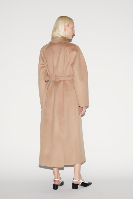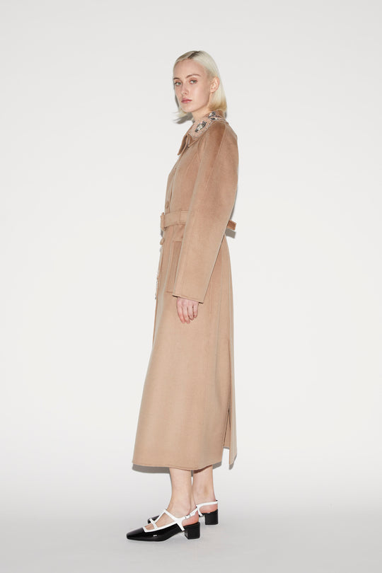 The Leonora Coat is a timeless investment piece, tailored in a luxurious wool-silk blend that offers both structure and fluidity. Cut with a clean, elongated silhouette, it features sharp shoulders, a refined collar, and discreetly placed pockets for a polished finish. Understated yet striking, this coat transitions seamlessly from day to evening, pairing effortlessly with both tailored separates and eveningwear. A modern wardrobe essential, the Leonora captures elegance through impeccable craftsmanship and enduring style.