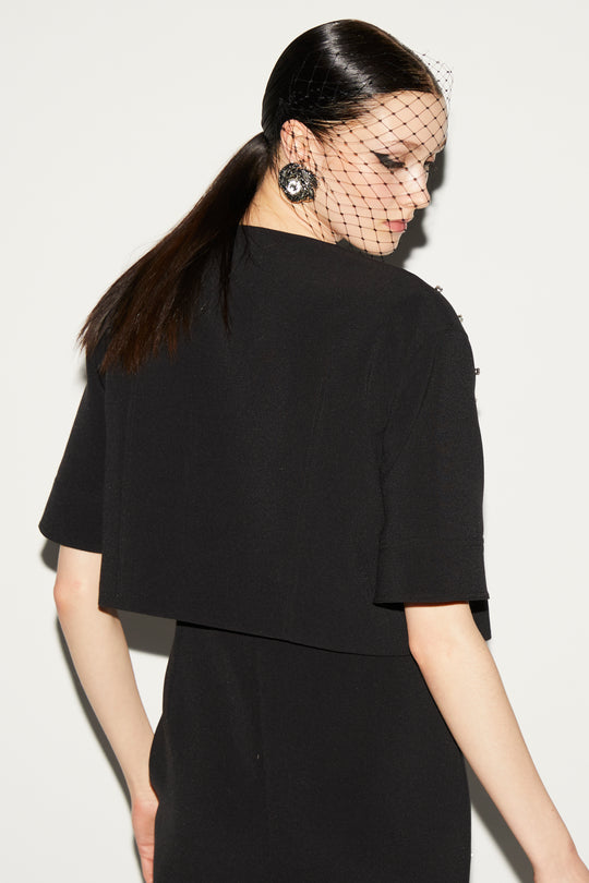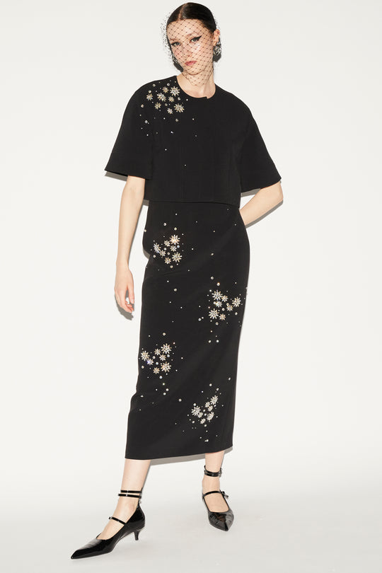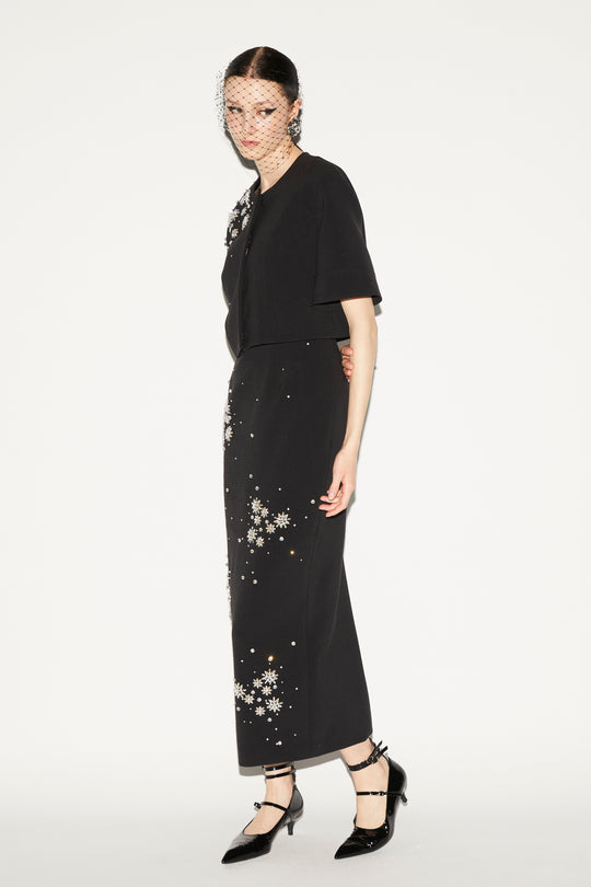 The River Jacket in black crepe is paired with the Brandy Dress. The jacket is designed with a sleek and structured silhouette, featuring floral embellishments on the upper chest patterns made from crystals. These embellishments add a touch of refined glamour to the piece, balancing sophistication with understated charm.