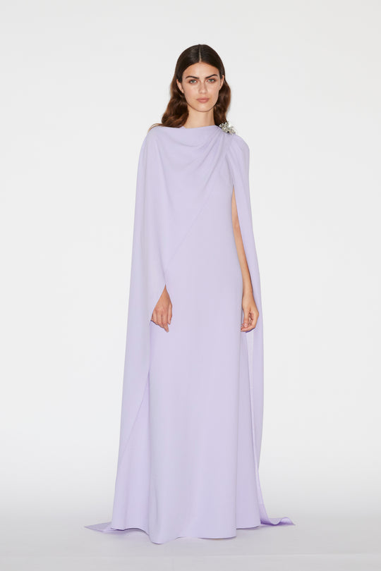 The Danica Gown is a study in understated elegance. Crafted in a soft purple sable hue, this floor-length silhouette drapes fluidly over the body, creating a graceful and elongated line. The design features an asymmetric cape overlay that falls effortlessly from the shoulder, offering full coverage while maintaining a modern, refined aesthetic.