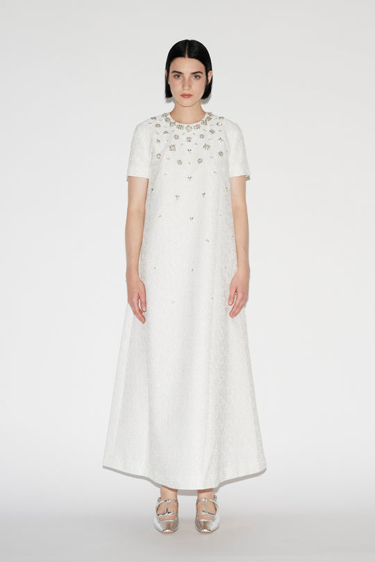 The Florian Dress in white is crafted in a cloque cloth with a subtle all-over floral texture. It has ornate hand-embroidered floral motif crystal detailing around the neck and cascading down the body.
