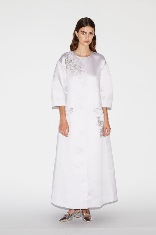Subtle crystal embroidery is delicately placed to add a soft point of embellishment, elevating the minimalist design with understated brilliance. The three-quarter sleeves and smooth, tailored construction create a poised and contemporary profile, making the Prudence Coat an ideal layering piece for formal occasions and evening events.
