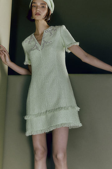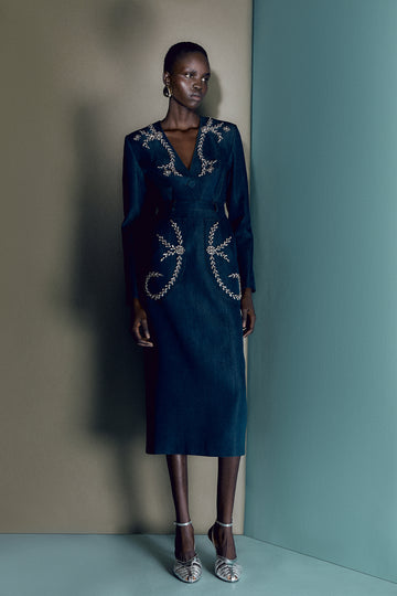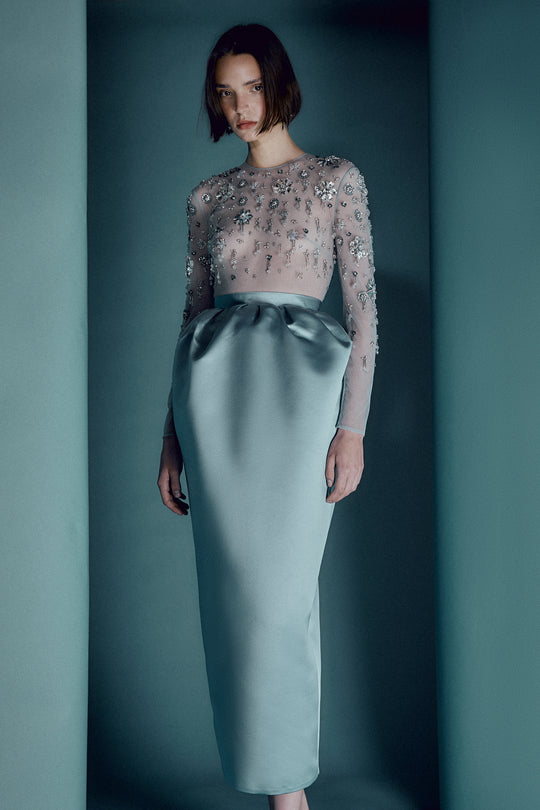 STARLA DRESS GREYISH BLUE EMBELISHED DUCHESS SATIN