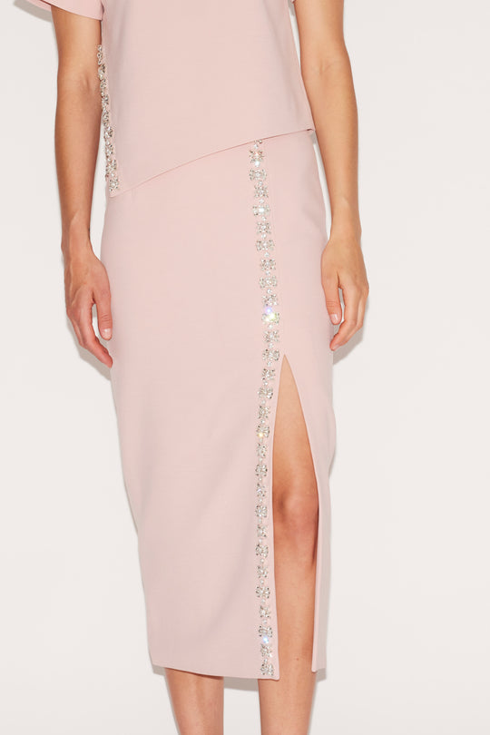 The Gia Skirt blends elegance with a contemporary edge. Cut from luxurious pink crepe, this midi-length skirt features a front slit accentuated by a line of dazzling crystal embellishments. It's streamlined silhouette skims the body for a flattering fit, offering just the right amount of movement and shimmer. Style it with the Sammie Top for a polished ensemble or contrast with a crisp white blouse for versatile sophistication.