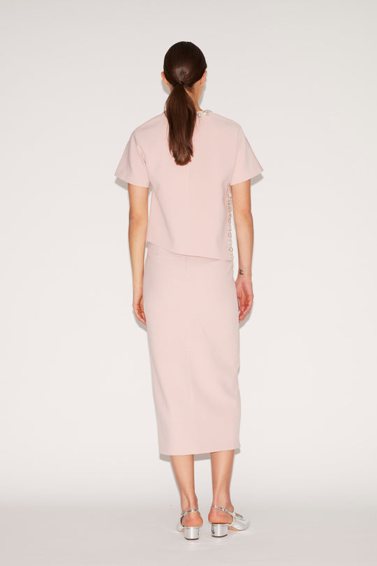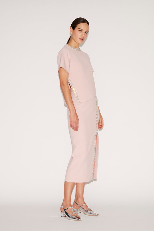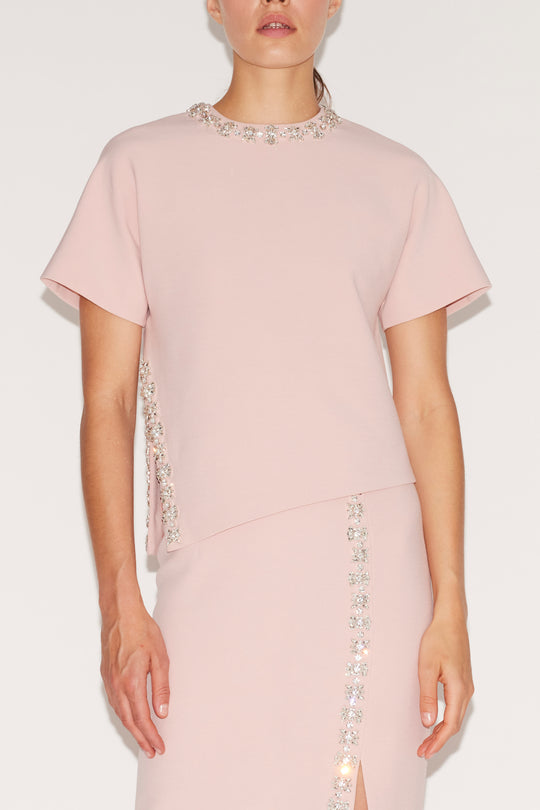 The Sammie Top is crafted from soft pink crepe. Designed with a relaxed silhouette, this top features short sleeves and a flattering boxy cut. Delicate crystal embellishments trace the neckline and side slit, adding a refined sparkle that catches the light with every movement. Perfect for pairing with tailored separates or the matching Gia Skirt for a coordinated statement look.