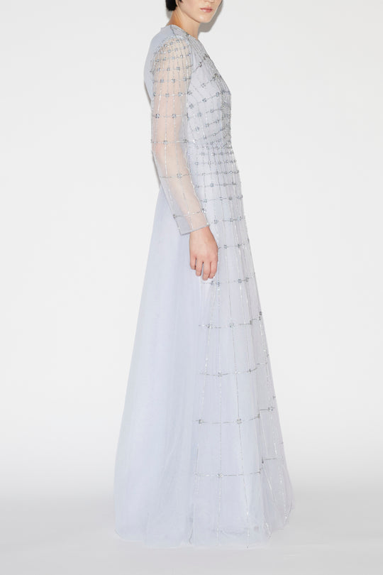 Elevate your elegance with the Anissa gown, a masterpiece of understated glamour. Crafted from delicate pale blue tulle, this ethereal dress is adorned with an intricate grid of shimmering embellishments, catching the light with every movement. The floor-length silhouette exudes timeless sophistication, while its sheer long sleeves and high neckline balance allure and modesty. Perfect for red-carpet events or formal soirées, the Anissa gown combines refined craftsmanship with a modern edge, ensuring you make an unforgettable statement.