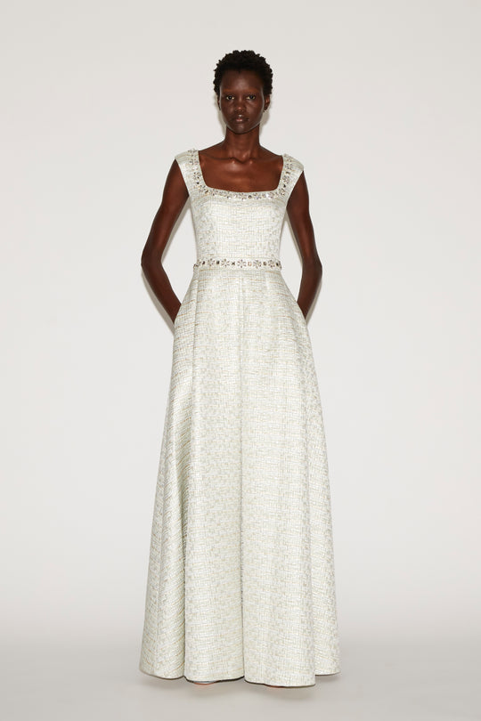 The Andi Gown is an elegant study in sculpted femininity, crafted from luminous mint jacquard that subtly shimmers with every movement. The structured bodice features a refined square neckline and wide straps, offering a clean, modern frame that highlights the collarbones and shoulders with effortless poise. Hand-applied crystal floral embellishments trace the neckline and encircle the waist, adding delicate sparkle and elevating the gown’s couture-inspired finish. From the waist, the silhouette opens into a full, floor-length skirt that creates a sweeping A-line shape—balancing architectural structure with graceful fluidity.
