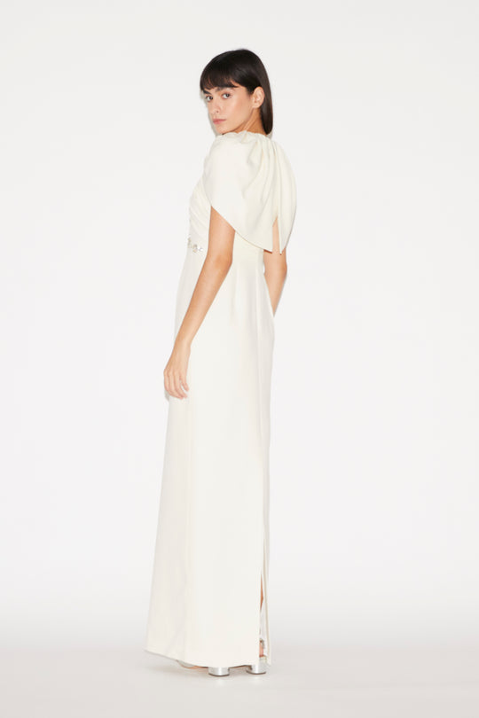 A sculpted, pleated bodice wraps across the shoulders to form a soft cape-like sleeve, adding gentle volume and architectural shape. The deep V neckline offers a feminine counterbalance, while a line of hand-applied crystal floral embellishments curves elegantly beneath the bust, subtly defining the waist.