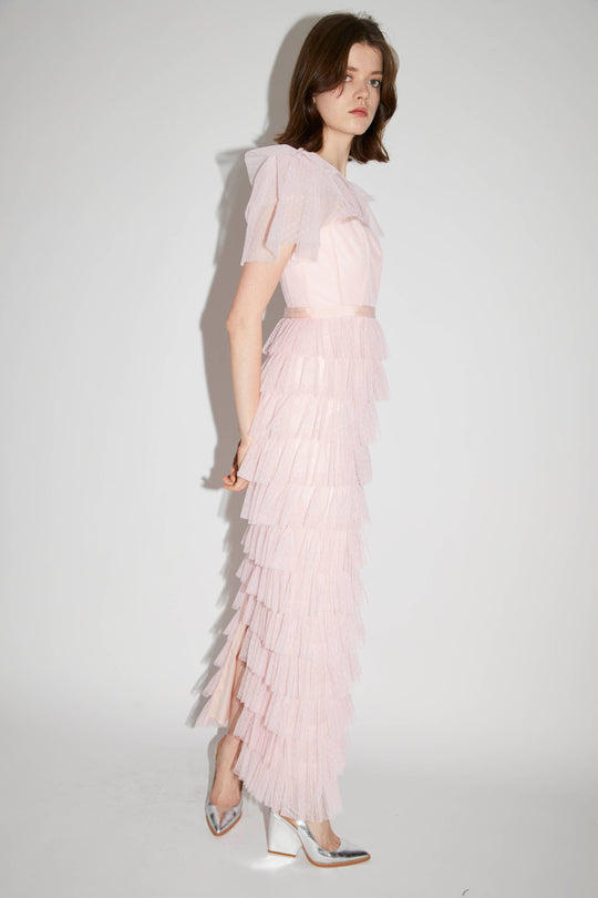 The Giuliana Dress is a tiered tulle ankle length gown crafted with meticulous attention to detail. This dress boasts a corset-inspired bustier construction that elegantly contours your silhouette, offering both support and style. Flutter sleeves add a whimsical touch as well as arm coverage. The tiered skirt exudes charm that's both feminine and sophisticated. Cut from a polka dot flocked tulle, this dress is perfect for attending a soirée, a romantic dinner, or a special celebration.