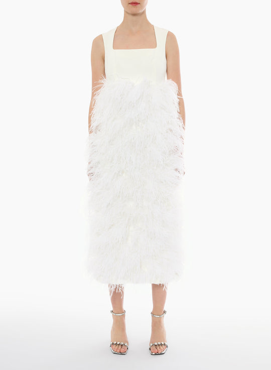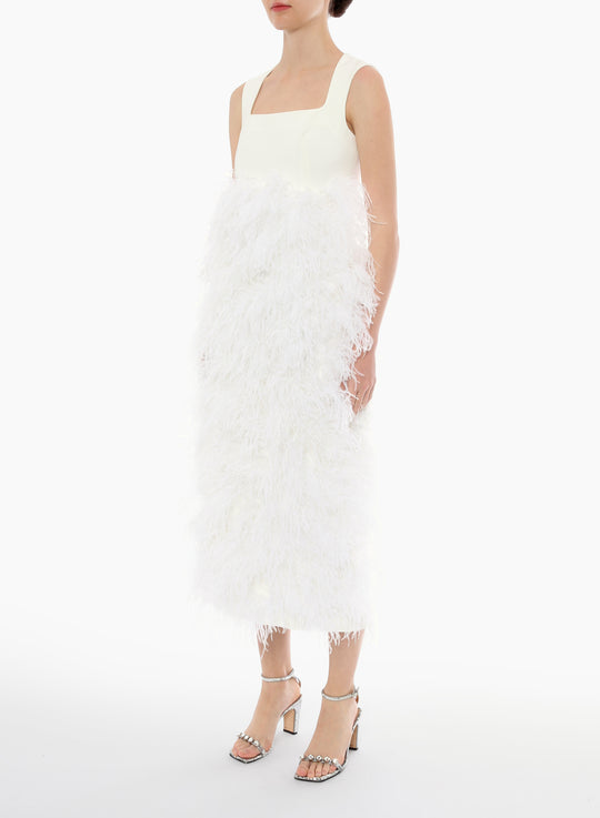 The Mabel is a sleeveless midi dress cut from recycled Italian crepe in a slim silhouette, covered in plumes of feathers through the front of the body. The Mabel has a square neckline and features a vent and concealed zip through centre back.