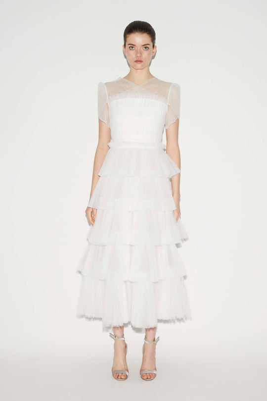 The Mae is crafted in white tulle and features short cross petal sleeves and the dress has internal boning to offer a secure and supportive fit through the body, while the voluminous ruffled skirts creating high movement.