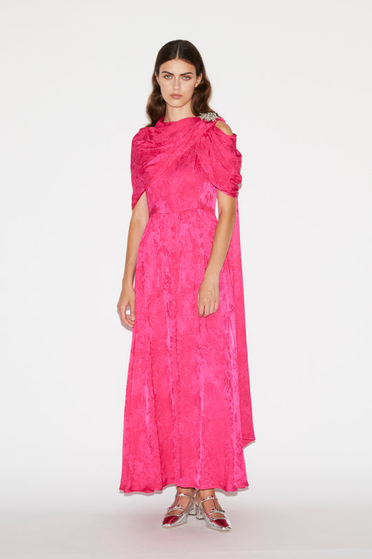 The Sallie Dress is a statement in modern elegance, crafted from lustrous fuchsia satin jacquard that catches the light with every movement. Designed with a dramatic draped silhouette and fluid full-length skirt, it exudes both romance and sophistication. The shoulder is detailed with a striking removable crystal brooch, allowing the dress to be styled with or without for versatile glamour. Finished with softly gathered sleeves and a flowing scarf detail, this piece is perfect for evening occasions where impact is essential.