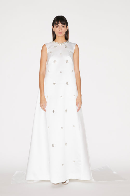 A statement in refined elegance, the Amoret Gown is crafted from white duchesse satin. This sleeveless, floor-length gown features a clean A-line silhouette adorned with delicate crystal embellishments across the front for a touch of subtle sparkle. At the back, satin bows add a romantic detail, cascading into a dramatic train for a graceful, sweeping finish. Perfect for formal events, galas, or evening occasions, the Amoret Gown combines timeless sophistication with modern charm.