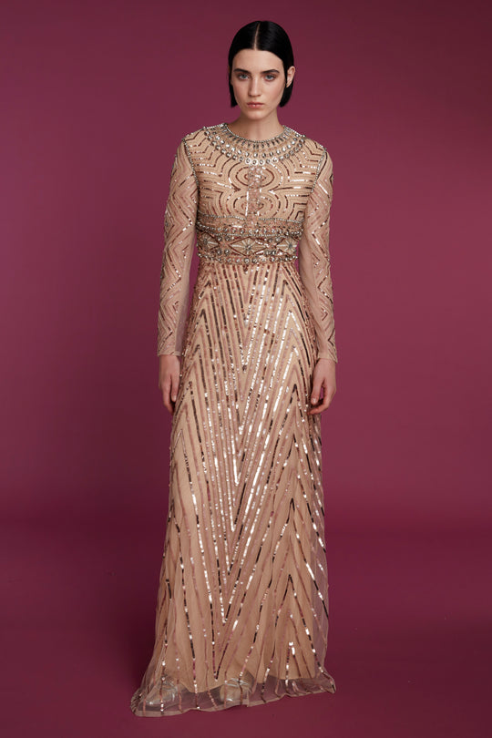 The Delphi Gown is meticulously hand-embroidered with crystals and sequins across a nude tulle base. Designed to catch the light with every movement, the gown features an elegant geometric motif that elongates the silhouette. Sheer long sleeves add a whisper of allure, while the intricate embellishment around the neckline and waist brings refined structure and regal detail. A statement piece for evening galas, formal events, or red carpet occasions, the Delphi Gown exudes timeless glamour with an ethereal finish.