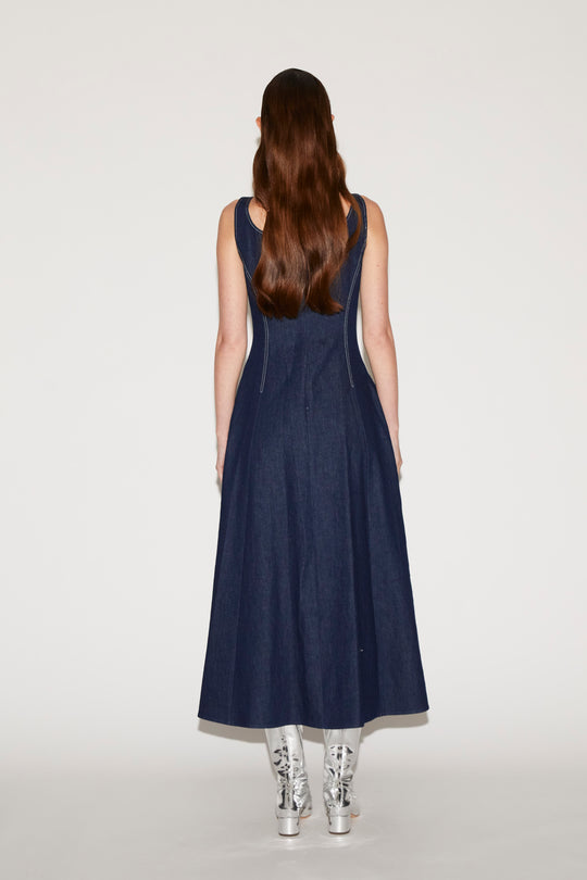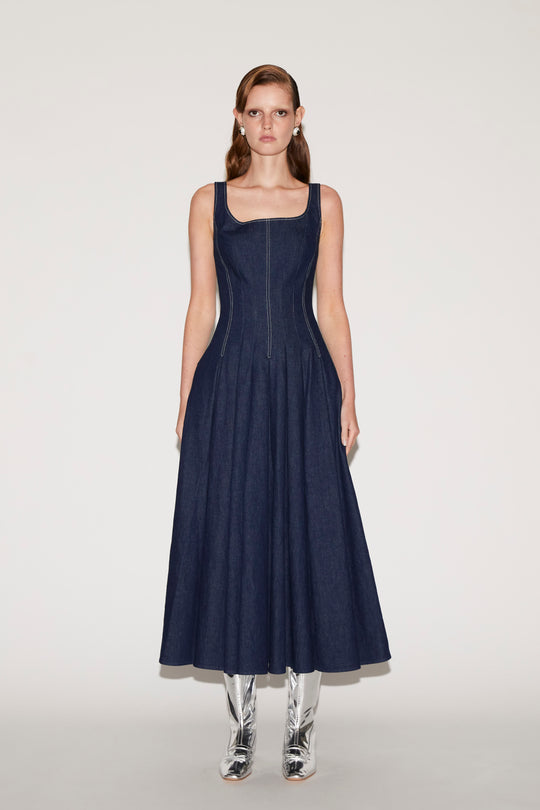 The Darla Dress reimagines classic denim through a refined, feminine silhouette. Crafted from structured indigo denim, the dress features a fitted bodice with contrast topstitching that accentuates the waist before falling into a full, flowing skirt.