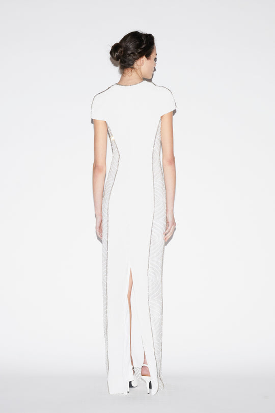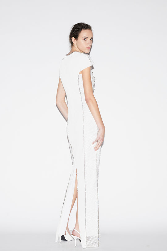 A true statement of craftsmanship and glamour, the Isobel Gown is entirely hand-embroidered, showcasing a mesmerizing display of artistry. This floor-length gown features intricate geometric patterns composed of shimmering sequins, radiant crystals, and mirror-like embellishments that catch the light with every movement. The cap sleeves and elegant silhouette flatter the figure, while the meticulous embellishment adds a rich, textural dimension. Perfect for the most elevated occasions, the Isobel Gown is a celebration of intricate detailing and timeless sophistication.