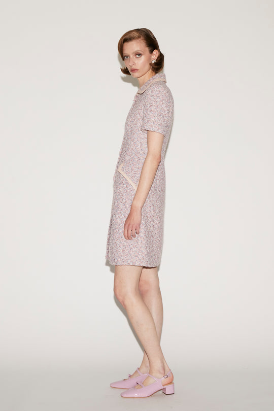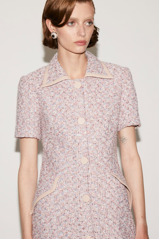 The Riley Dress brings a modern, feminine touch to classic tweed tailoring. Crafted from soft pink tweed with subtle multicolour flecks, this short-sleeved mini dress offers a refined, structured silhouette that feels effortlessly polished. Tonal faux leather trims highlight the collar, pocket edges, and button placket—adding a clean, contemporary contrast to the textured weave.