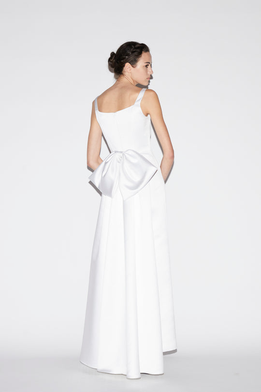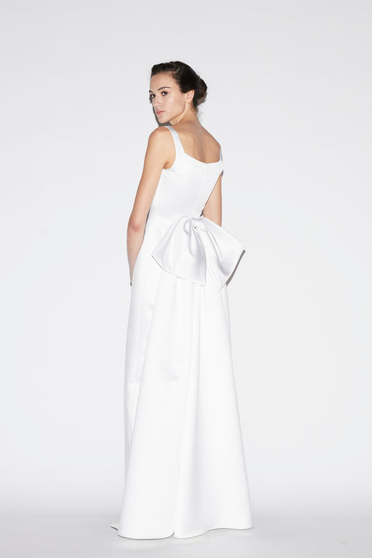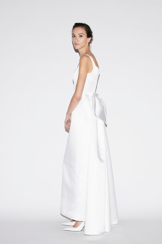 Sculptural elegance meets refined glamour in the Shannon Gown, expertly crafted from luxurious duchesse satin. This sleek, floor-length gown features a flattering square neckline and architectural silhouette that effortlessly elongates the figure. At the back, two dramatic bows serve as standout details—one fixed for structure and the other detachable for versatile styling. Whether worn with both bows for a bold statement or with just one for a subtler finish, the Shannon Gown offers a contemporary take on classic eveningwear with a playful twist.