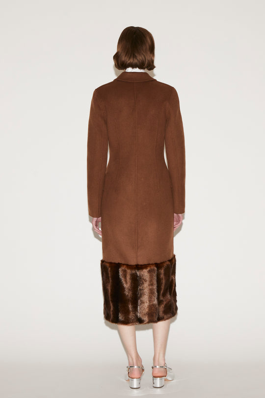 The Tessa Coat is a statement in timeless sophistication and modern texture. Tailored from rich brown wool, it features a clean, structured silhouette with softly defined shoulders and a fitted waist. A contrasting panel of luxurious faux fur at the hem adds depth and movement, creating a refined balance between classic tailoring and contemporary detail. Finished with covered buttons and discreet pockets, the coat embodies effortless elegance.