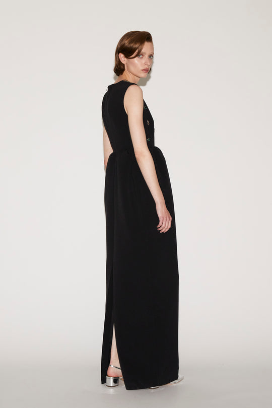 Elevate your eveningwear with timeless sophistication in the Virginia Gown. Crafted from luxurious black crepe, this floor-length silhouette features a structured, sleeveless bodice delicately adorned with hand-applied crystal embellishments in rich jewel tones. The gown cinches gently at the waist before falling into a clean, elongated skirt, creating a statuesque profile that exudes modern elegance.