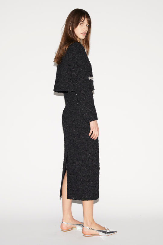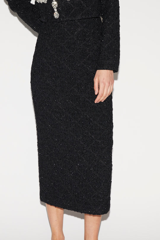 The Vania Skirt in black tweed is a modern ode to refined glamour. With its sleek midi length and clean pencil silhouette, this skirt is designed to elongate the figure while offering an understated statement.