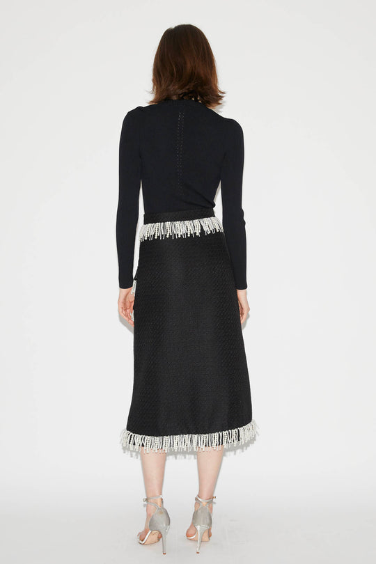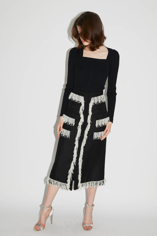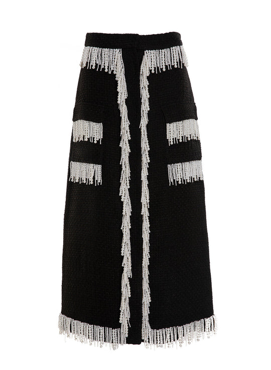 The Victoria Tweed Skirt is a midi skirt in black tweed with a front split and white pearl fringing. The Victoria is part of our Core collection and one of our most poular styles.