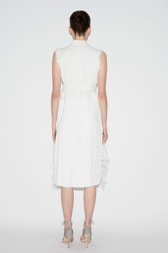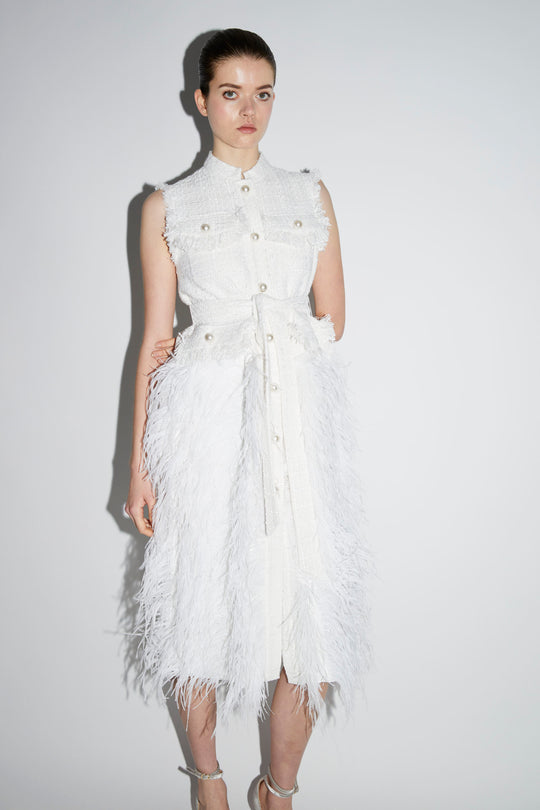 The Wyatt Gilet in Ivory Tweed is a multifunctional piece that can be worn as a dress or layered. The tweed has lurex threads that give a beautiful sheen. The ostrich feathers adorn the front while the back is pleated crepe. Comes with a self tie belt.
