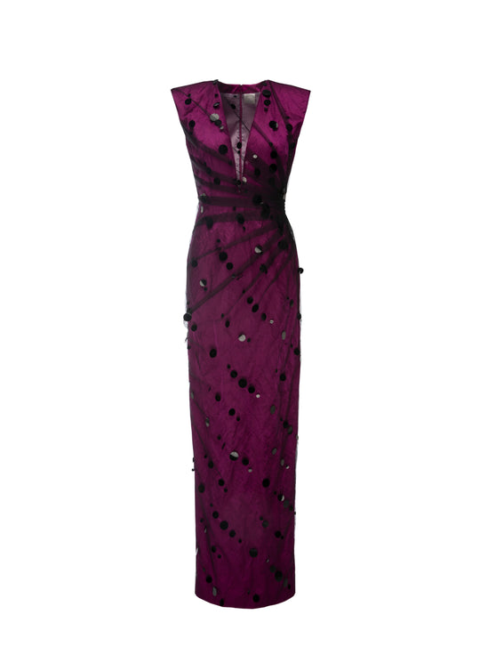 The Leilani Gown is a V neck form fitting cotton blend gown with padded shoulders. It is covered in a sequin embroidered tulle fabric. The gathered fabric detail on the waist becomes a focal point and accentuates the waist.