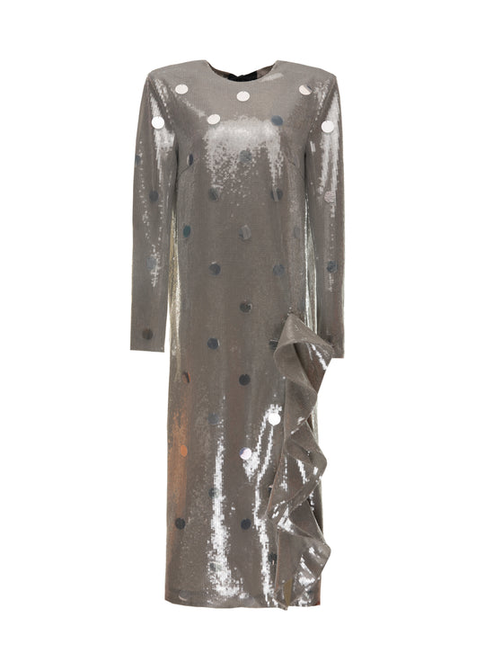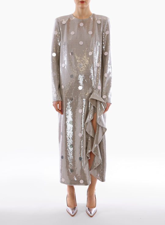 The Lyra is an allover sequin long sleeved midi dress with a boxy fit. The skirt features a thigh high slit with ruffle details creating beautiful movement. The front of the dress is enrichened with an overlay of large sequin discs for extra sparkle. The open back of the dress is finished with elegant black contrast grosgrain bows.