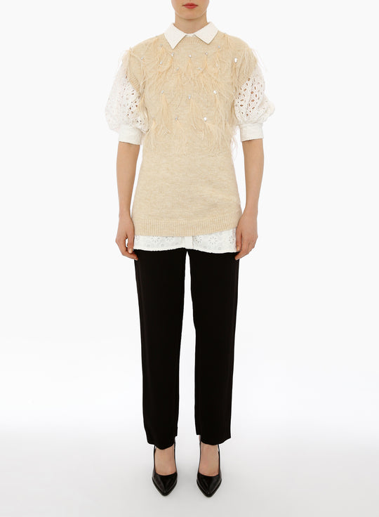 The Silvan vest is made of a soft wool blend knit, adorned with delicate sequin and feather embroidery. Can be worn sleeveless or layered.